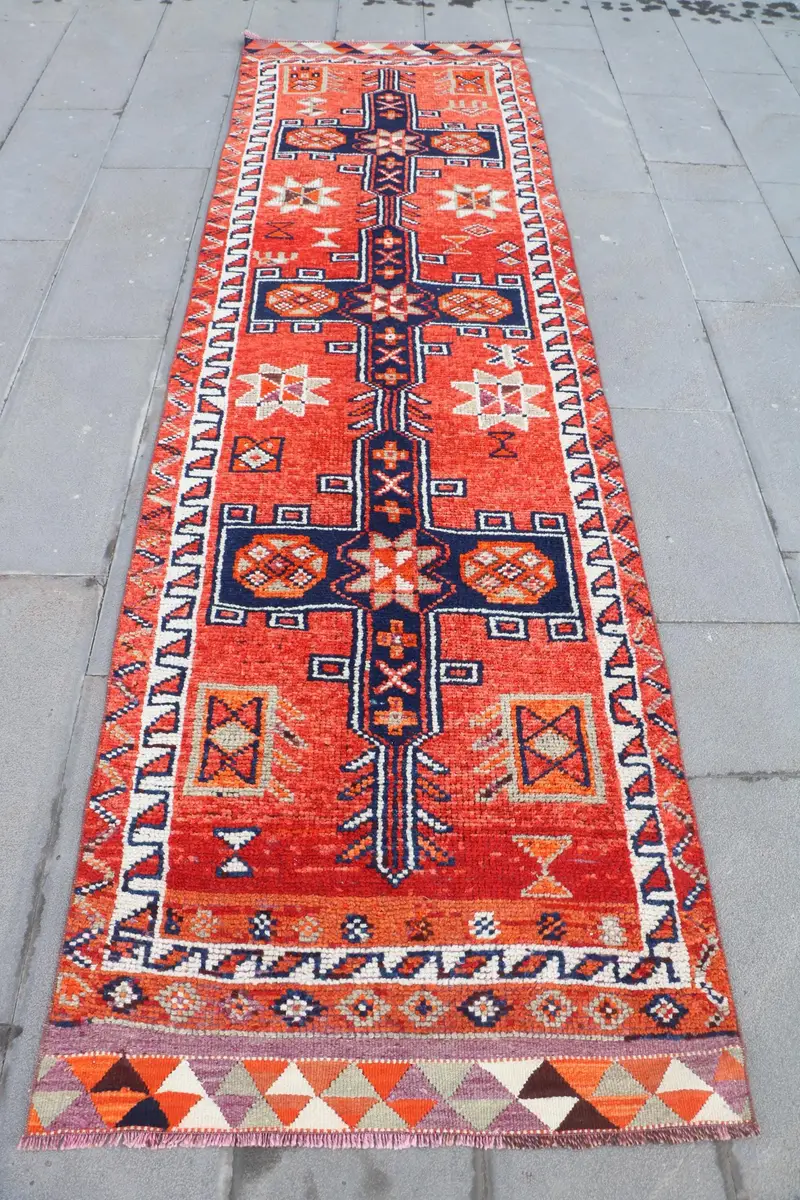 レッドイカットラグ、3x10.6フィートの鮮やかな装飾
