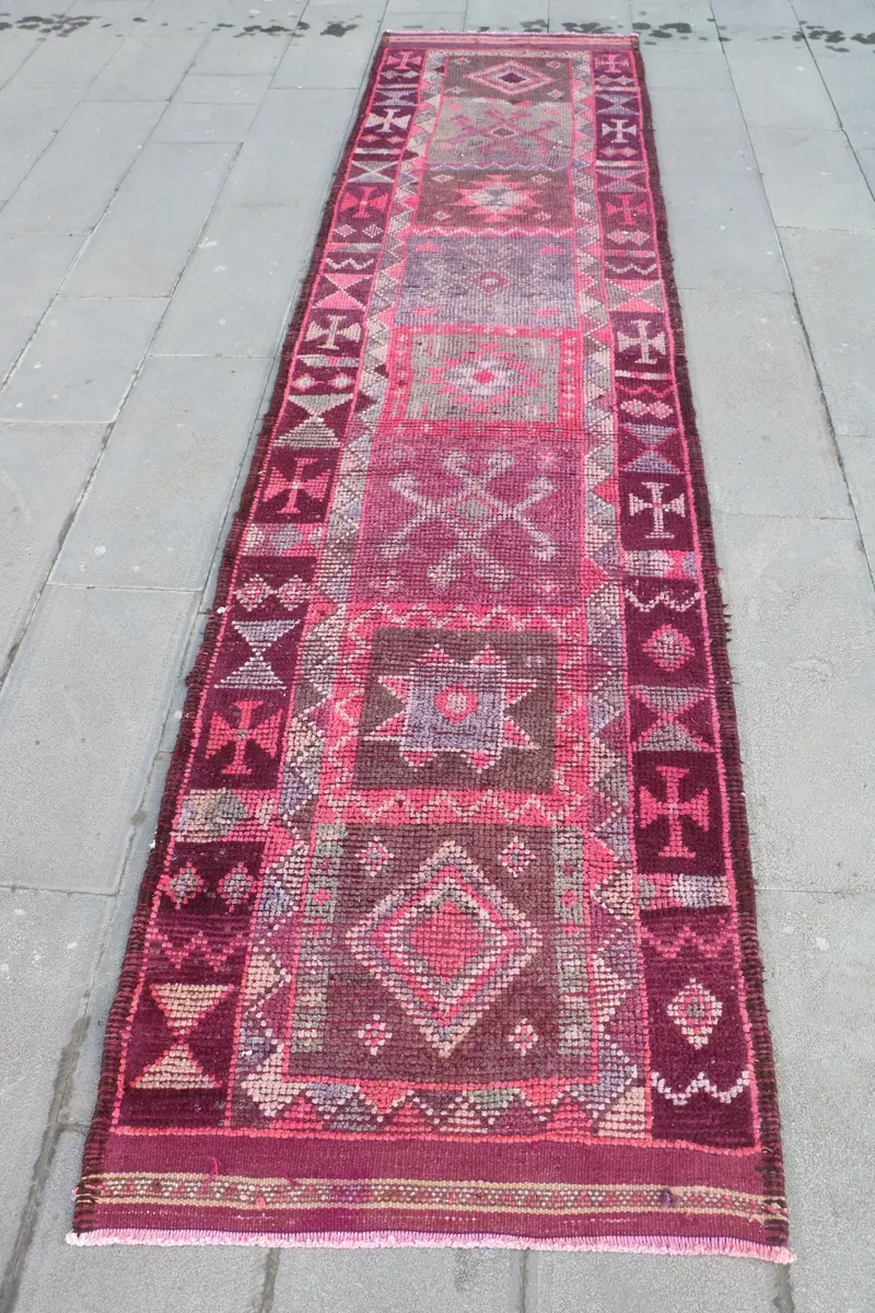 エレガントなピンクのペルシャ絨毯、2.9x12.2フィート、パープルのアクセント付き