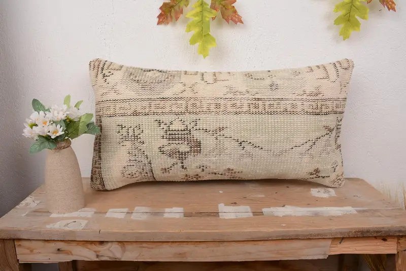ベージュ & ブラウンの花柄刺繍入り枕、多用途 12x24 クッション