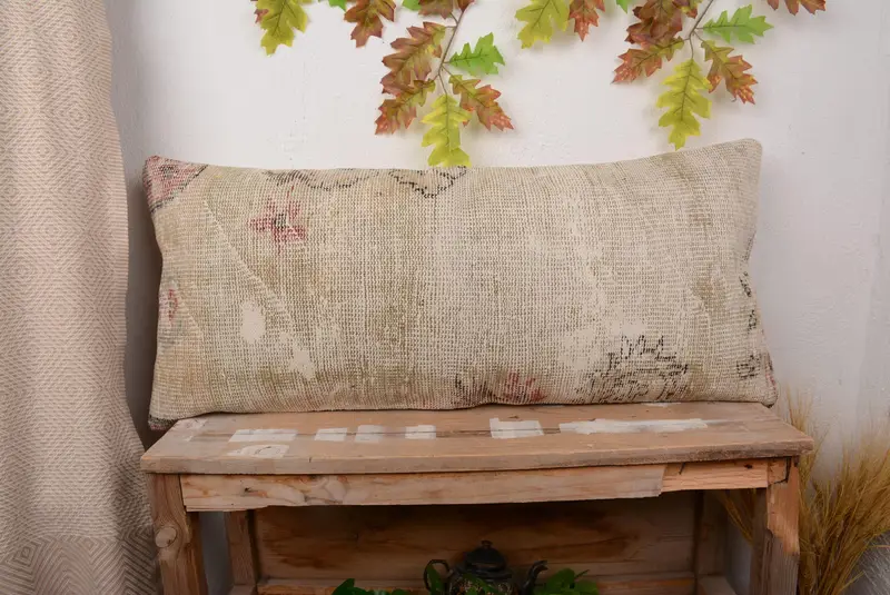 刺繍入りベージュ&ブラウン花柄クッション、16x36手作りリネン枕