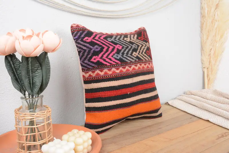 手作りの刺繍入り枕、ピンクとオレンジのストライプのクッション