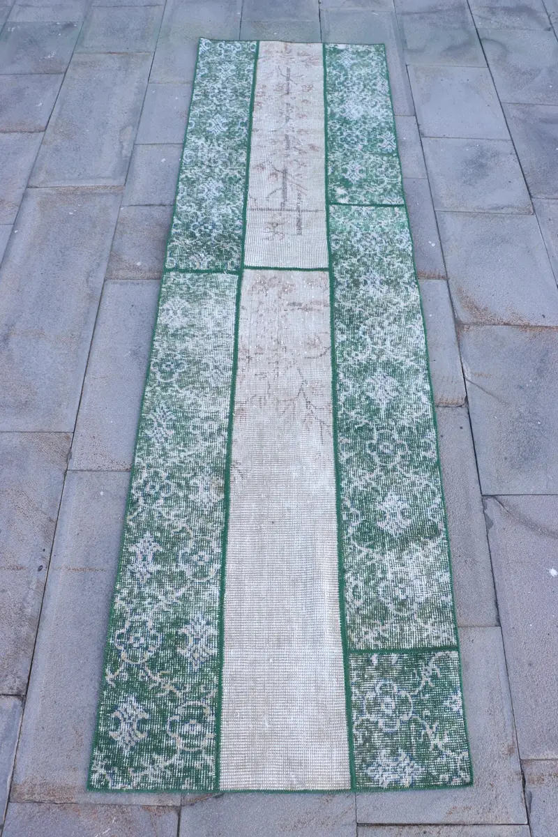 エレガントなグリーン&ベージュチェックラグ、2.2x7.8フィート
