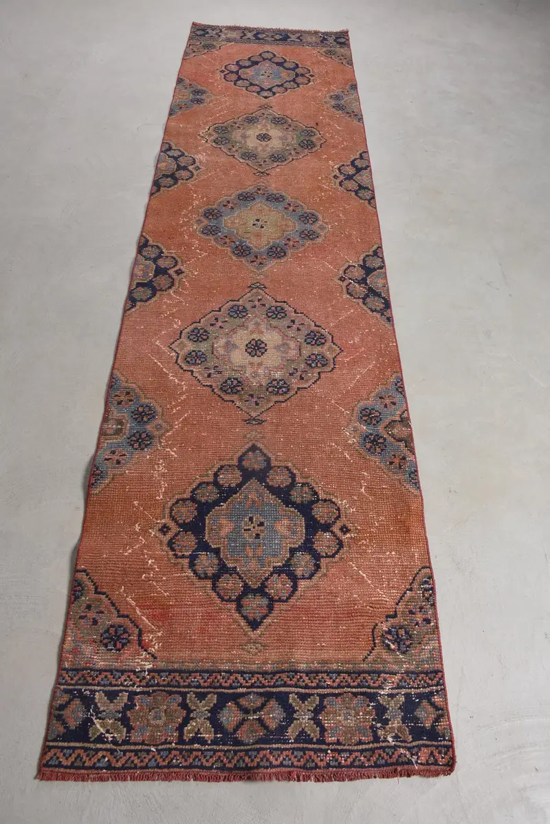 鮮やかなオレンジとブルーのラグ、2.6x10.6フ...
