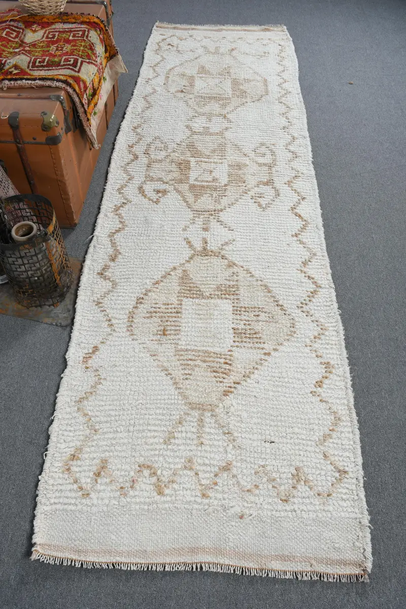 ホワイトの幾何学模様のラグ、2.9x9.9フィート、ブラウンの花柄モチーフ