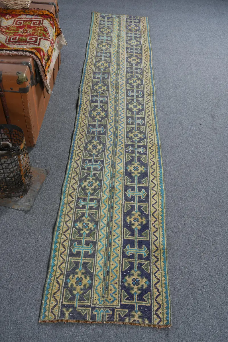 ブルーのパッチワークラグ、1.8x9.7フィート、イエローのアクセント付き