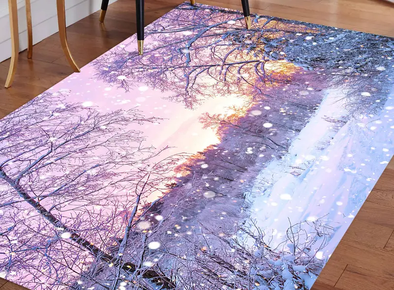 Snow View 冬の風景プリントラグ、モダンな森のデザイン