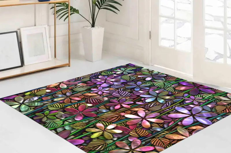 鮮やかな花柄プリントラグ:ピンク、パープル、抽象的、モダンなデザイン