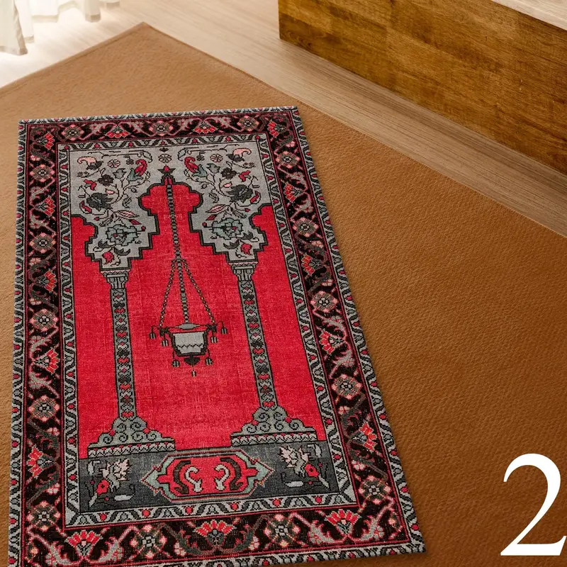 赤い花柄プリントの祈りの敷物、トルコのヴィンテージパターンデザイン