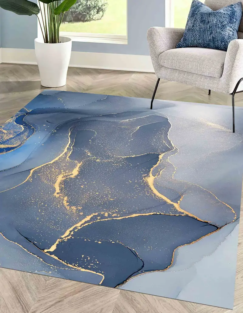 ブルーマーブルのコンテンポラリープリントラグ: モダンなゴールドのアクセント