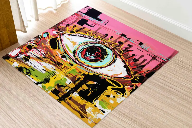 鮮やかな落書きアイプリントラグ、カラフルなピンクのデザイン、モダンなホーム