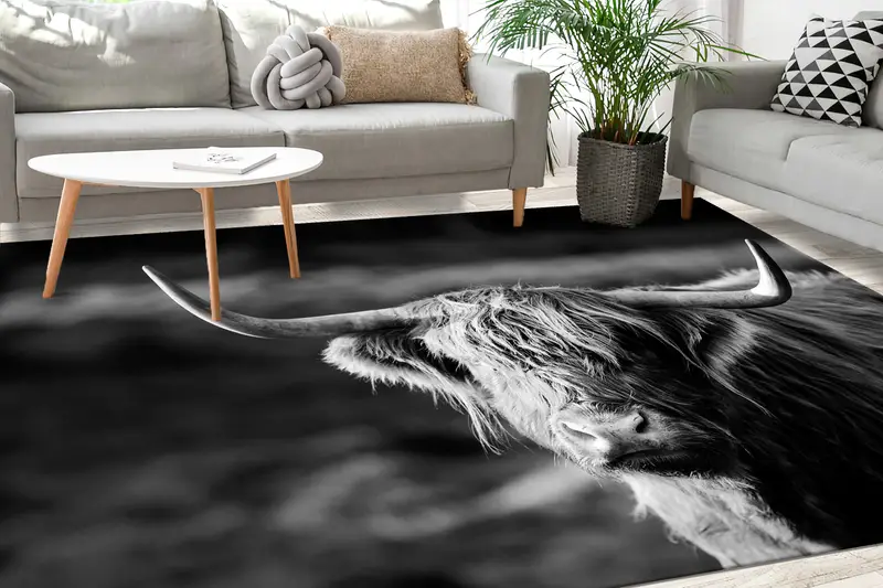 雄大なハイランド牛をフィーチャーした自然からインスピレーションを得たアニマル プリント ラグ