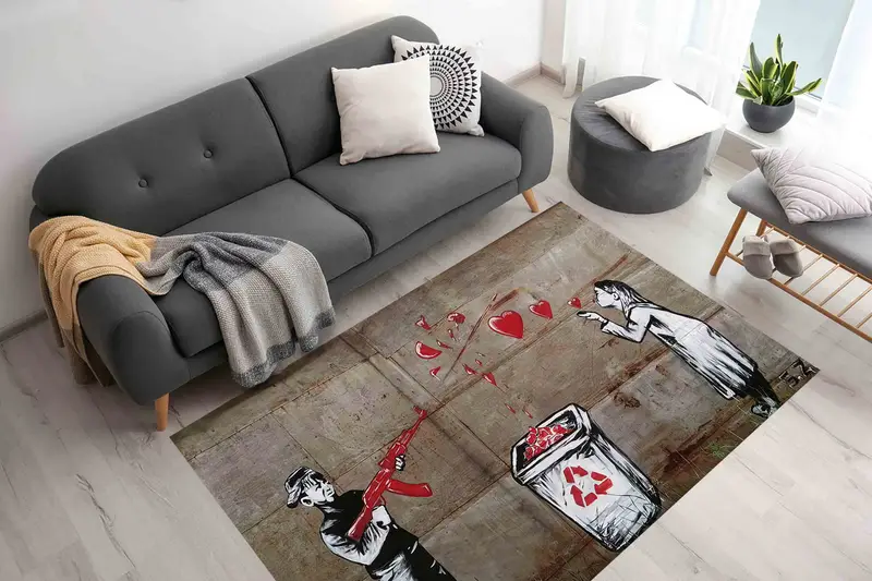 バンクシー グラフィティ プリント ラグ: 愛、女の子、ハート、戦争、リサイクル