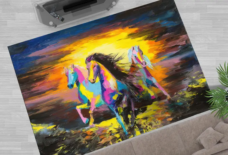 抽象的な馬の夕日プリント ラグ: 馬愛好家のための鮮やかなオイル アート