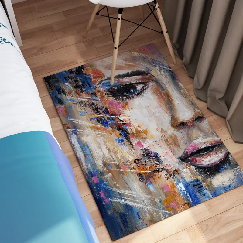 肖像画からインスピレーションを得たモダンなプリントラグ: 抽象的な女性のデザイン