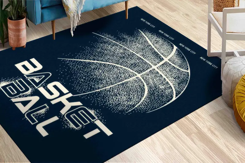 ネイビーブルーのバスケットボールボールプリントスポーツラグ、モダンなアスレチックデザイン