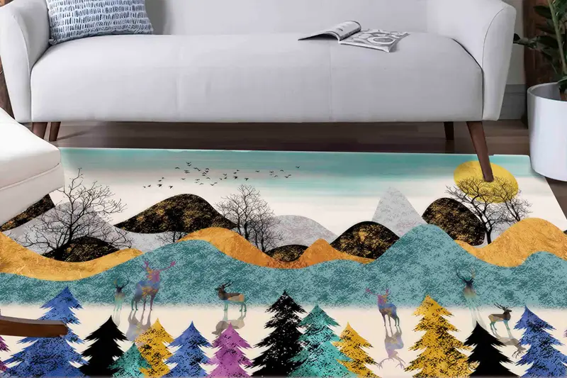 鹿の森の風景プリントラグ、抽象的な山の風景