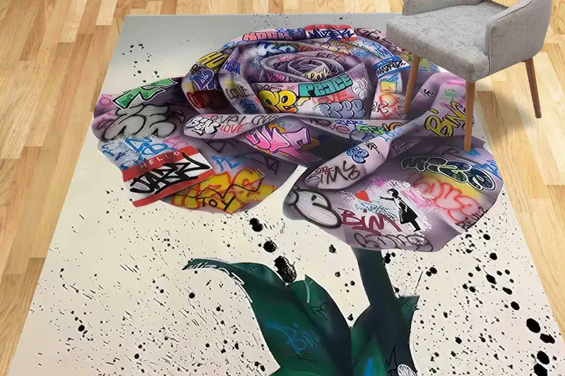 ローズグラフィティプリントラグ:バンクシーにインスピレーションを得たモダンな室内装飾
