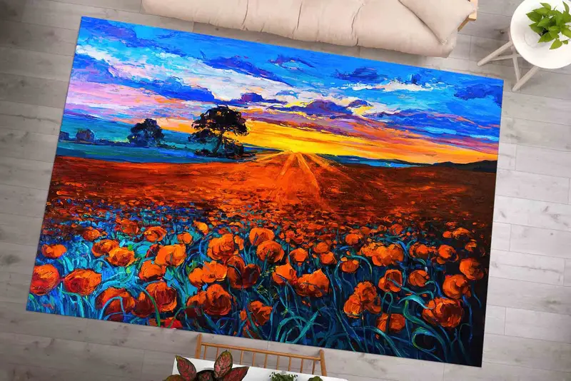 アヘンケシの風景プリントラグ: 赤い花畑の夕日のデザイン