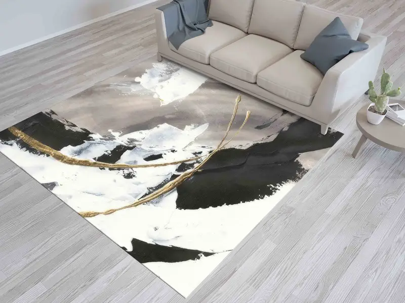 ゴールドとブラックのきらめくプリントラグ、現代的なデザイン