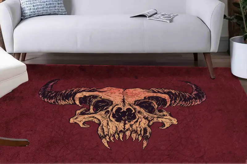 バーガンディ デビルリッシュ モダン プリント ラグ: 悪魔のようなホラー デザイン