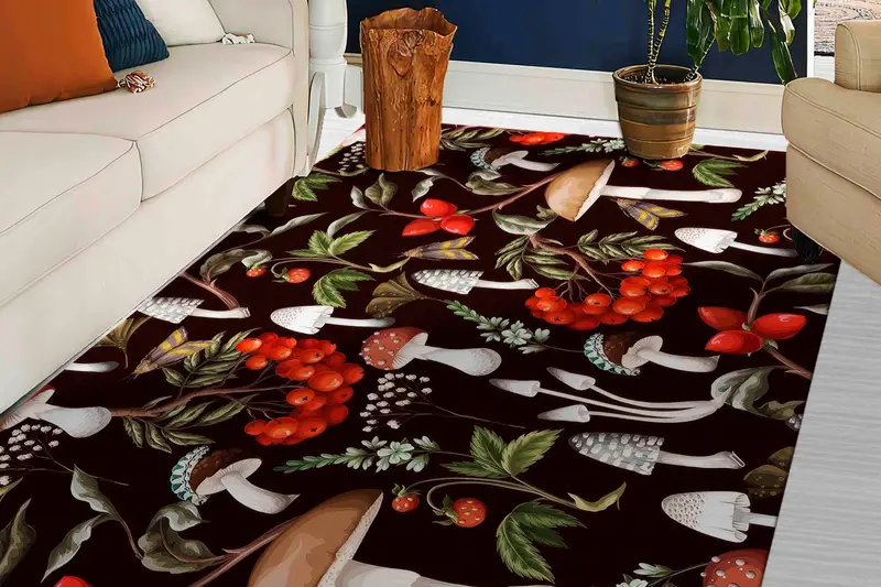 キノコ柄モダンプリントラグ、カラフルなブラックデザイン