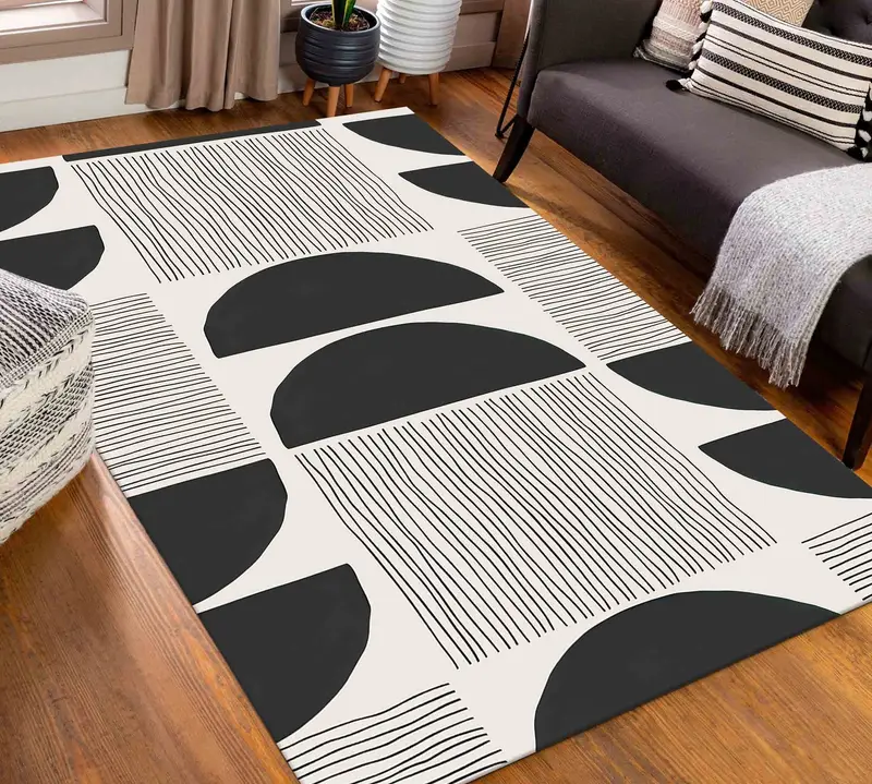 幾何学模様のノルディックボヘミアンプリントラグ: モダンなミニマルデザイン