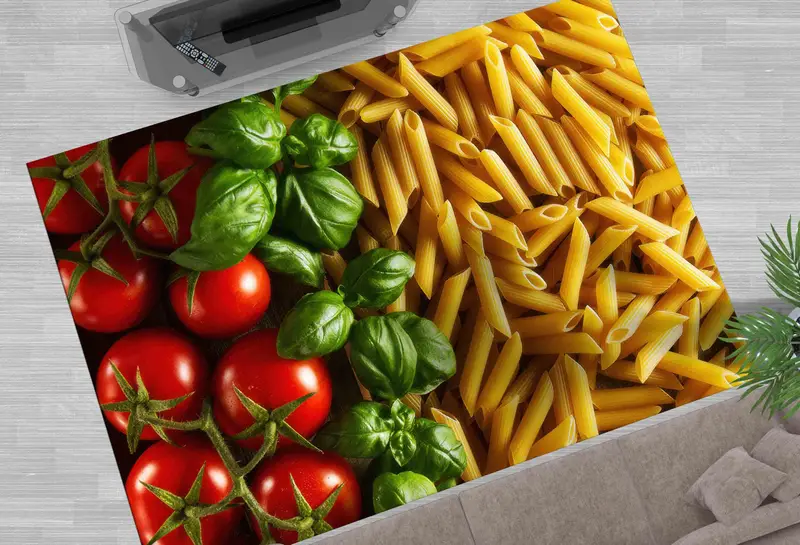 トマトとバジルのプリントラグ、モダンなキッチンデザイン