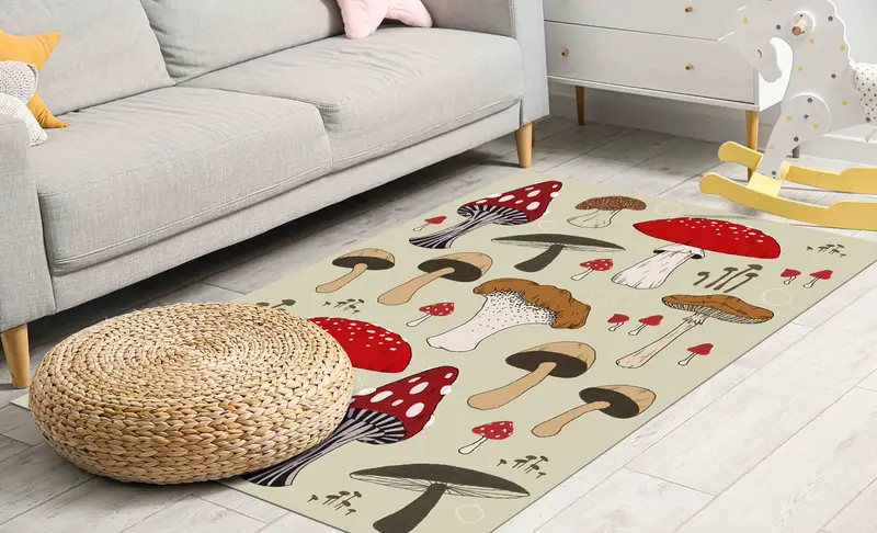 レッド & ベージュ マッシュルーム プリント ラグ - モダンなデザイン
