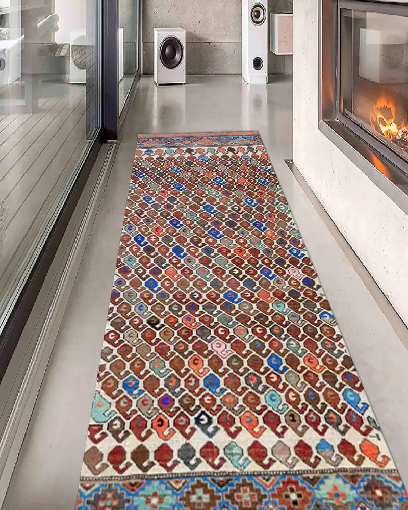 ヴィンテージ柄プリントラグ: ブルー、ブラウン、オレンジの色合い