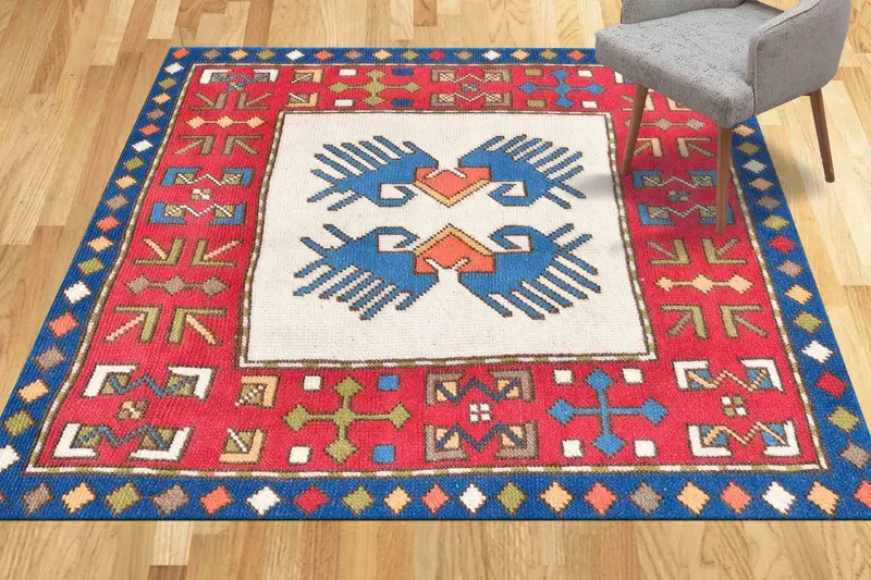 レッド & ネイビー ブルー ヴィンテージ幾何学模様プリント ラグ、正方形デザイン