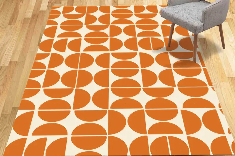 オレンジの幾何学模様のモダンなプリントラグ、ミッドセンチュリーボヘミアンデザイン