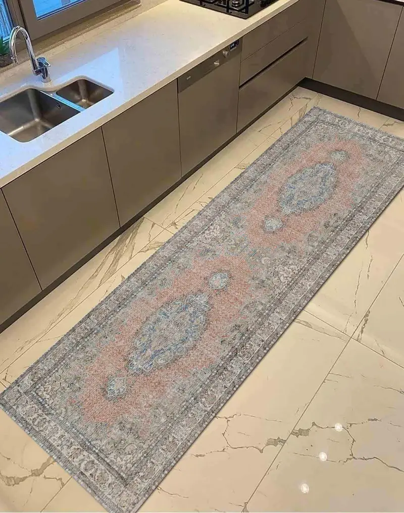 ヴィンテージメダリオンプリントラグ、ソフトグリーン、ブラウン、ネイビーブルートーン