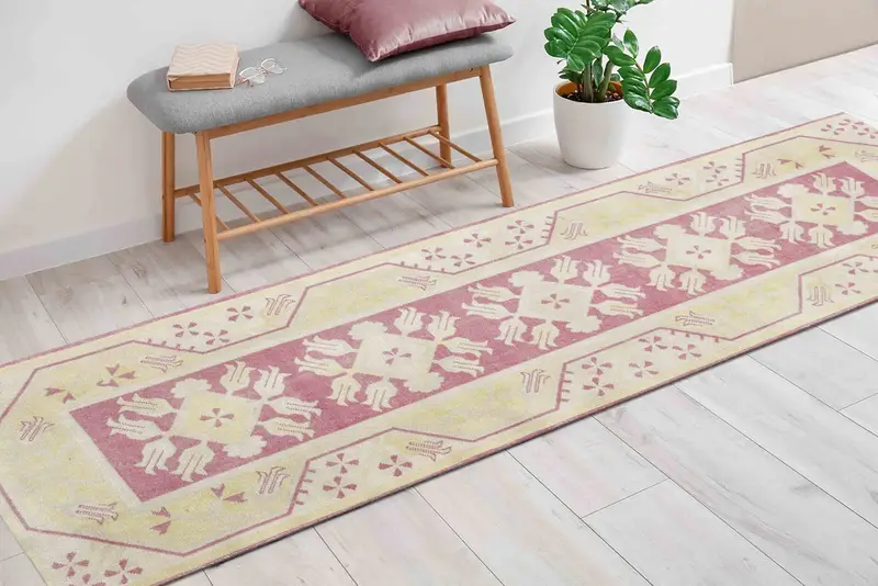 幾何学模様のピンク & イエロー ナバホ プリント ヴィンテージ ラグ、プリント デザイン