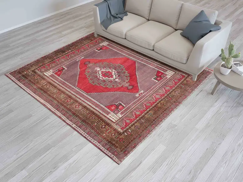 レッド メダリオン ヴィンテージ 色あせた Oushak パターン プリント ラグ