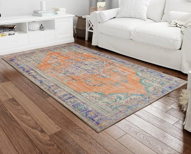 ヴィンテージ色あせたエスニックパターンのオレンジとパープルのメダリオンプリントラグ
