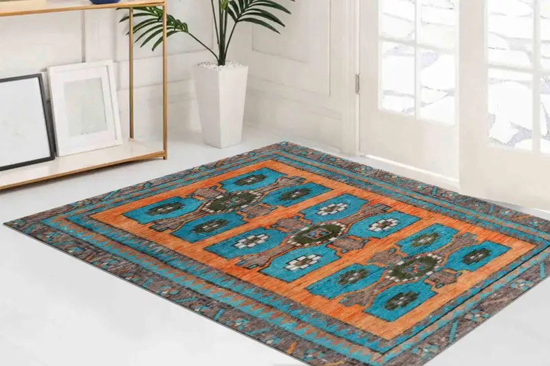 ヴィンテージ ボヘミアン ブルー & オレンジ エスニック パターン プリント ラグ