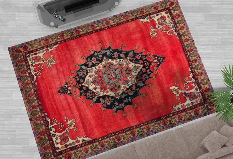 レッド & ブラウンの色あせた Oushak プリント ラグ、ヴィンテージ ソフト トーン