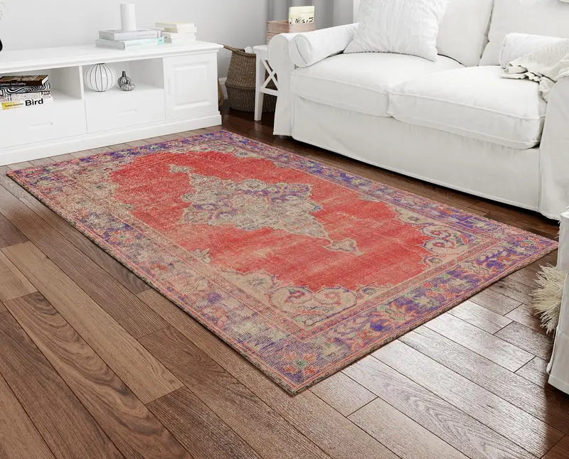 レッドメダリオンヴィンテージ花柄プリントラグ、豪華なヴィンテージデザイン