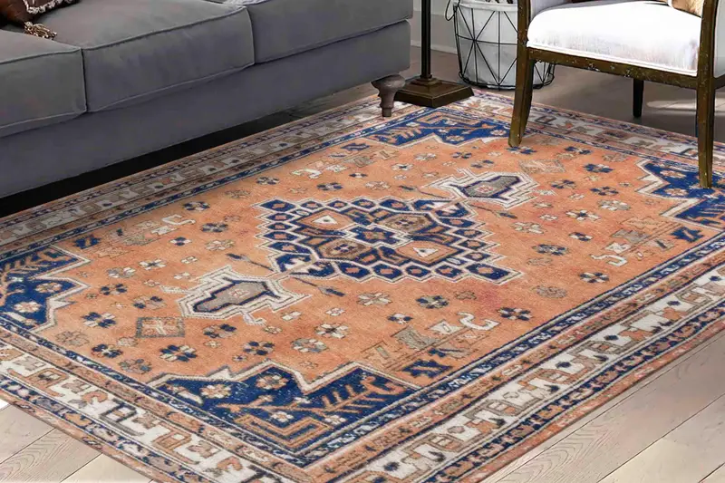 柔らかな色合いのネイビーブルーメダリオンヴィンテージプリントラグ