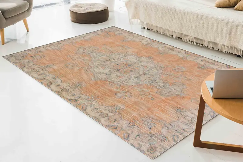 柔らかなオレンジとブラウンのヴィンテージ Oushak パターン プリント ラグ