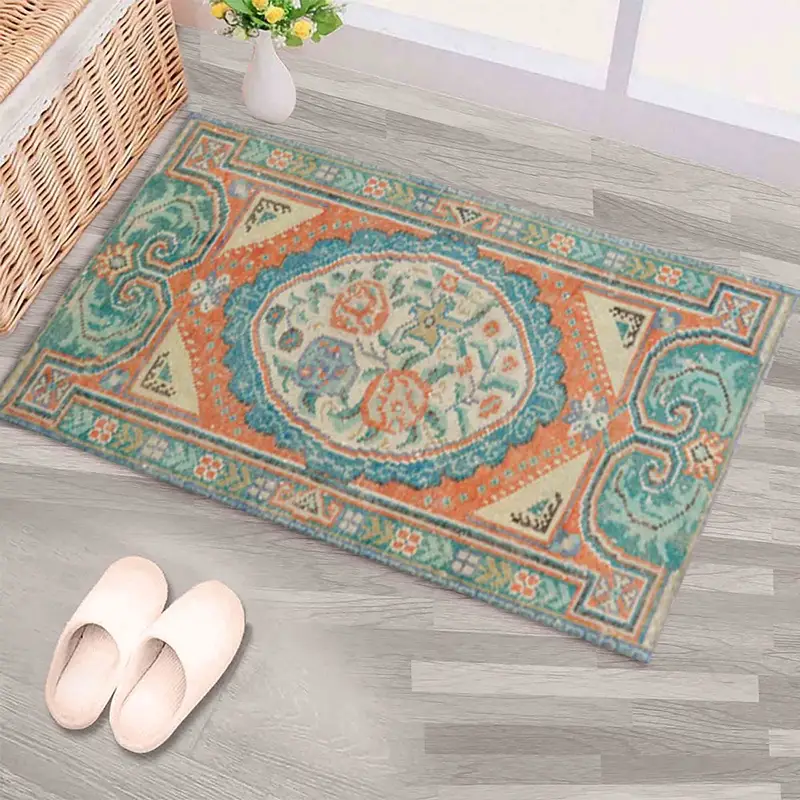 オレンジとグリーンのヴィンテージフラワーパターンプリントラグ