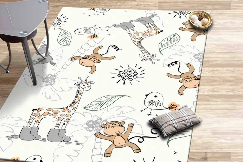 Monkey & Giraffe キッズラグ、ソフトトーン、ミニマリストデザイン