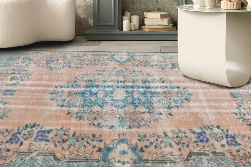 ブルーメダリオン花柄プリントラグ: ヴィンテージ色あせたデザイン