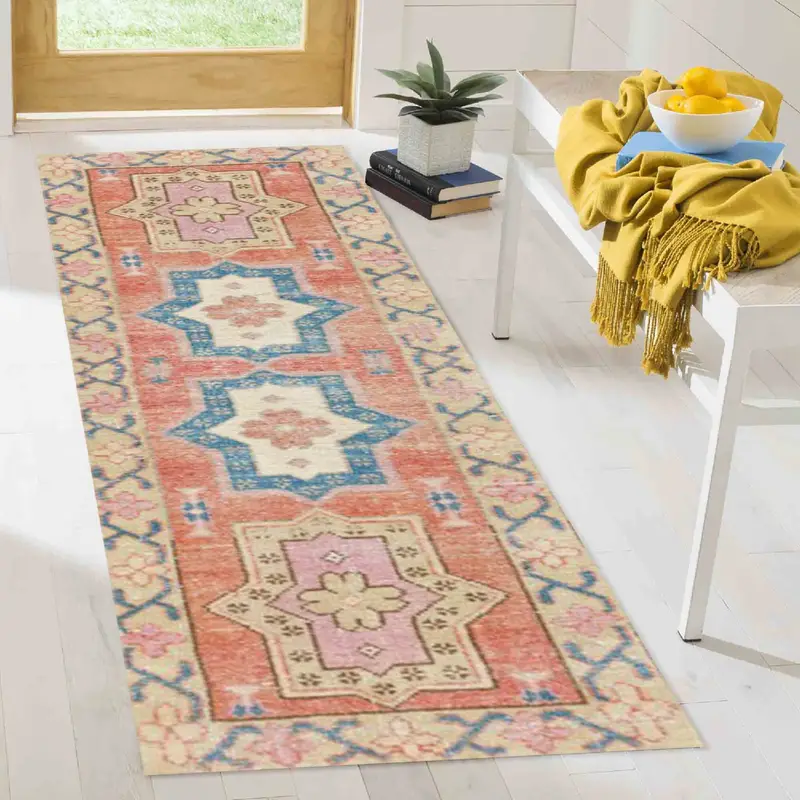 オレンジ & ブルー ヴィンテージ キリム プリント ラグ ナバホ幾何学模様