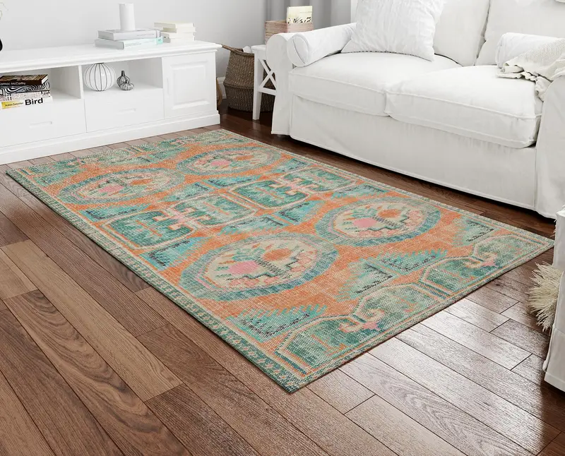 グリーン & オレンジの花柄プリント ラグ ヴィンテージ トルコ柄