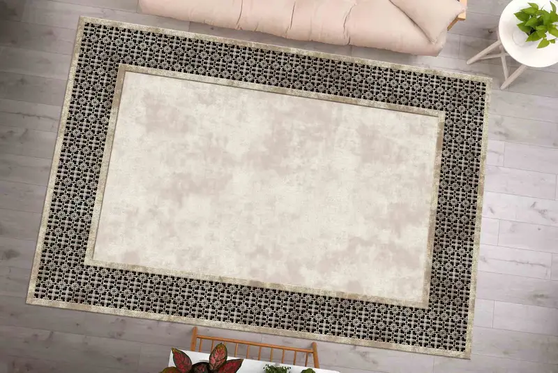 ソフトトーンのモダンな抽象幾何学プリントラグ、おしゃれな空間に最適