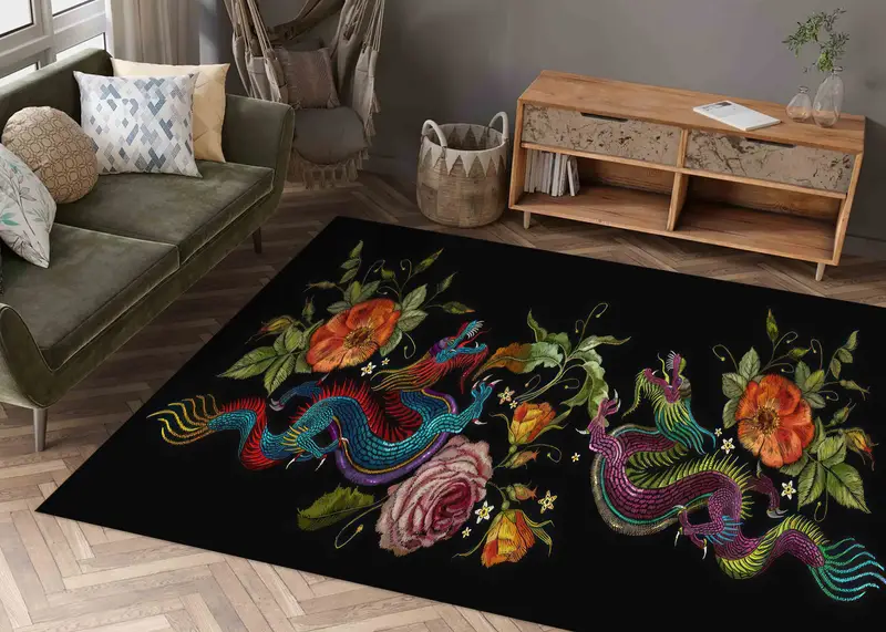 龍モチーフプリントラグ:モダン・和柄・花柄融合