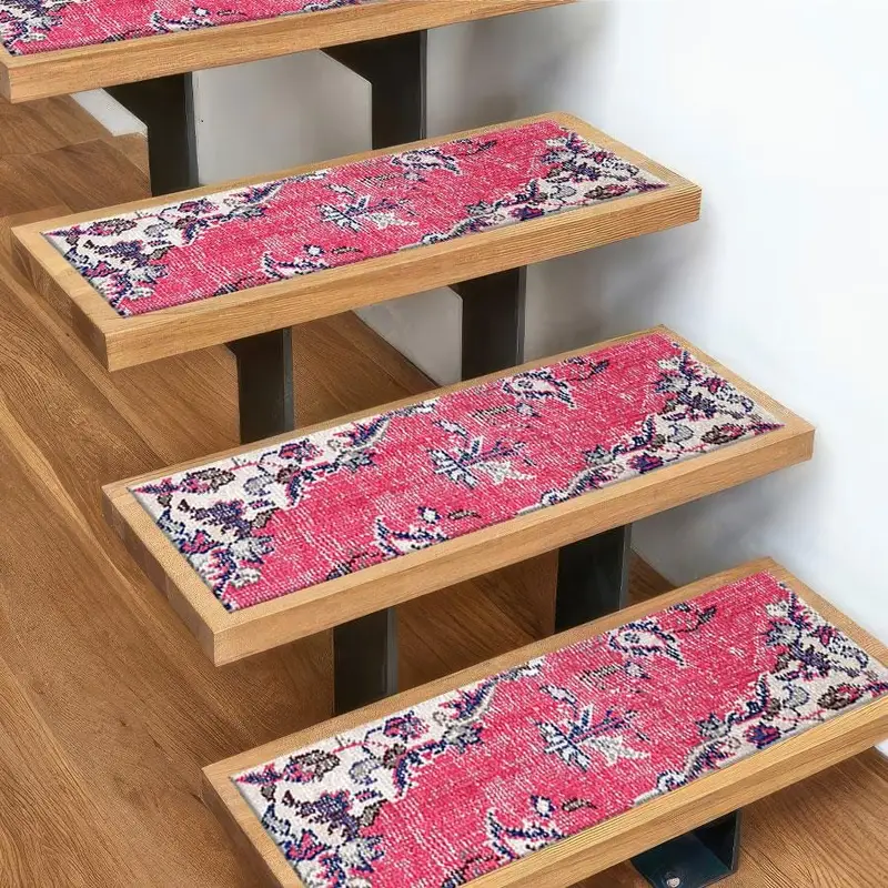 レッドエスニックプリントラグ:ネイビーブルーキリムステップラグ