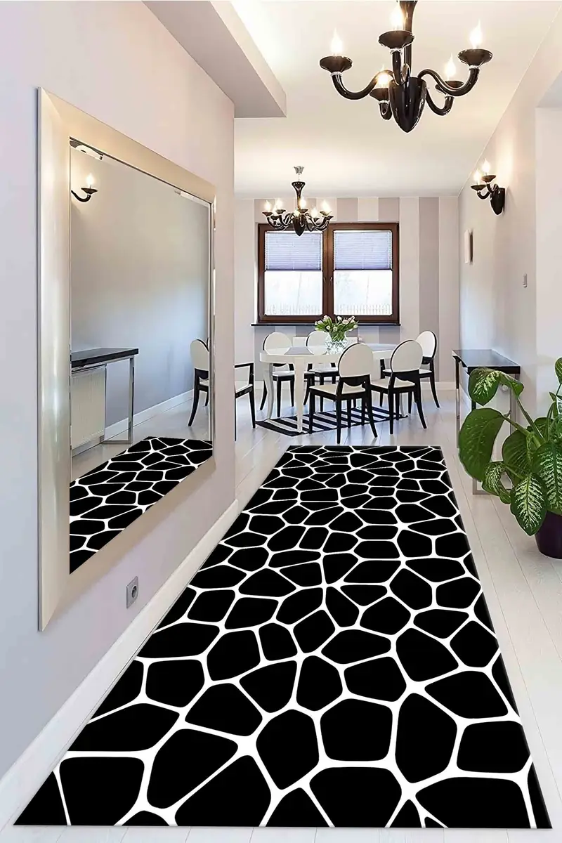 黒と白のプリントラグ、トレンディなボヘミアンミニマルデザイン
