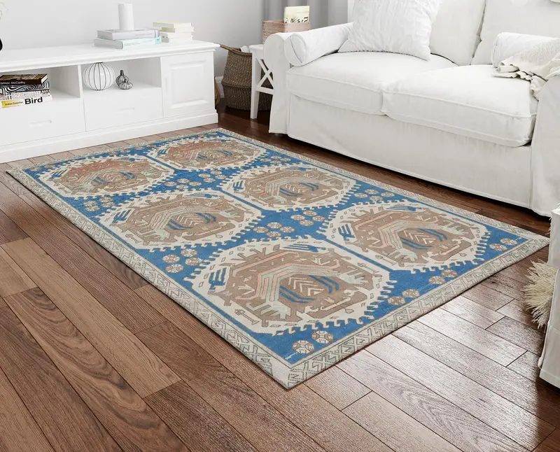ヴィンテージ ブルー & ブラウン デザイン プリント ラグ: 時代を超越したエレガンス